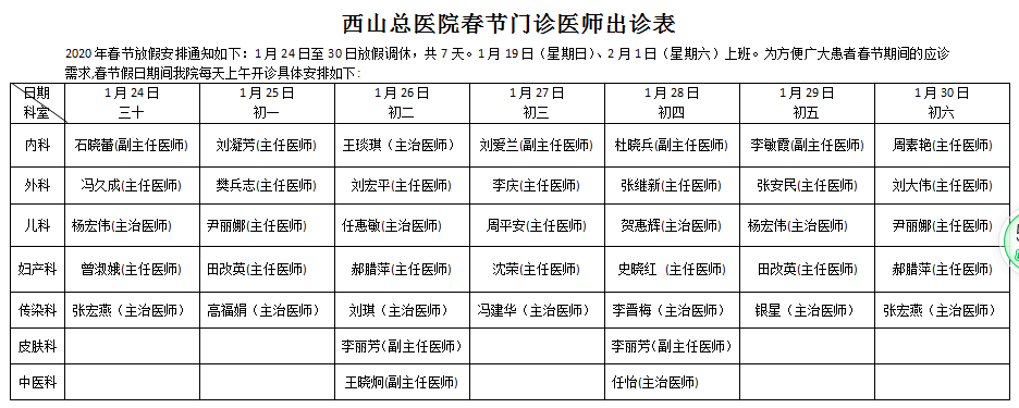 春节将至,根据国家法定节假日安排,今年的春节放假时间为1月24日至1月30日。春节期间,如果不小心生病了该如何就诊,西山总医院已提前做好安排: