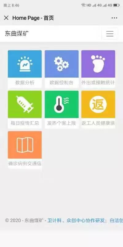 面对这种情况,东曲矿党政积极发挥该矿众创中心软件创新工作室的作用,经过多天研究,开发出了《东曲煤矿冠状病毒疫情防控系统》。该系统于1月28日首次试运行上线,2月5日正式投入使用。该矿相关工作人员、基层各单位卫计联络员、隔离职工可通过手机登录微信公众号及电脑网页进行上传、访问、查询相关信息。